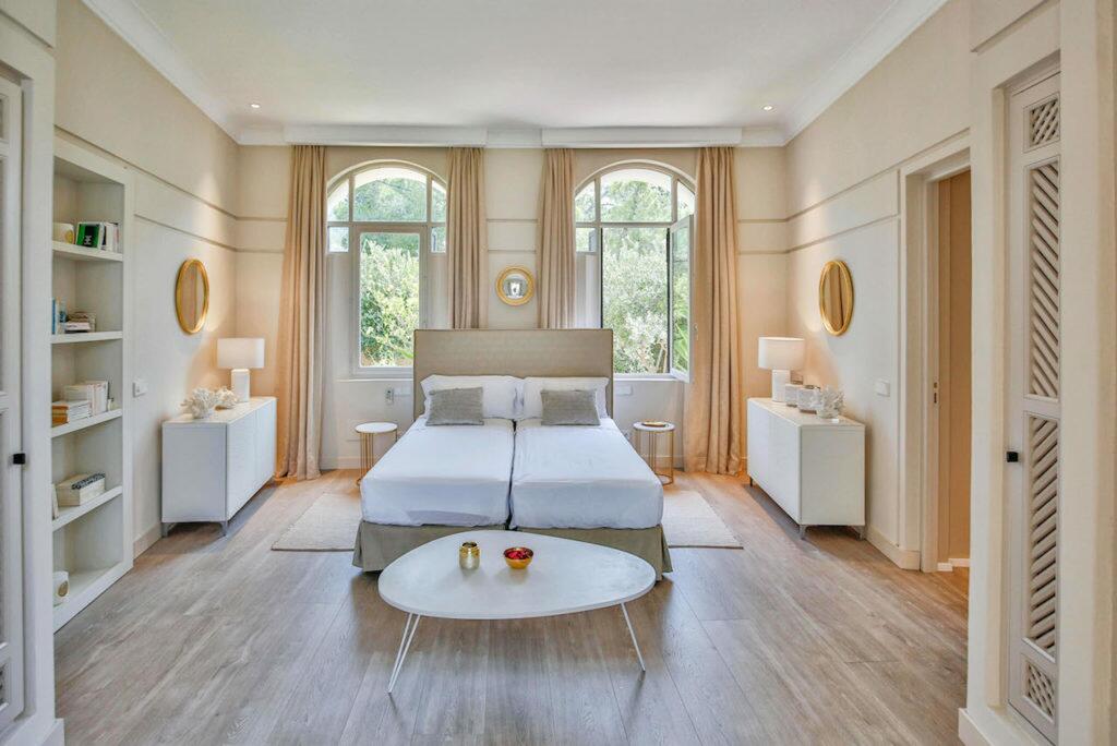 The villa’s interior combines natural stone and wood with Italian design. Its open-plan layout includes a grand entrance hall with a fireplace, a fully equipped Gaggenau kitchen, a spacious dining area, and a stylish living room with sea views. Each of the five en suite bedrooms has outdoor access, enhancing the seamless indoor-outdoor living experience.