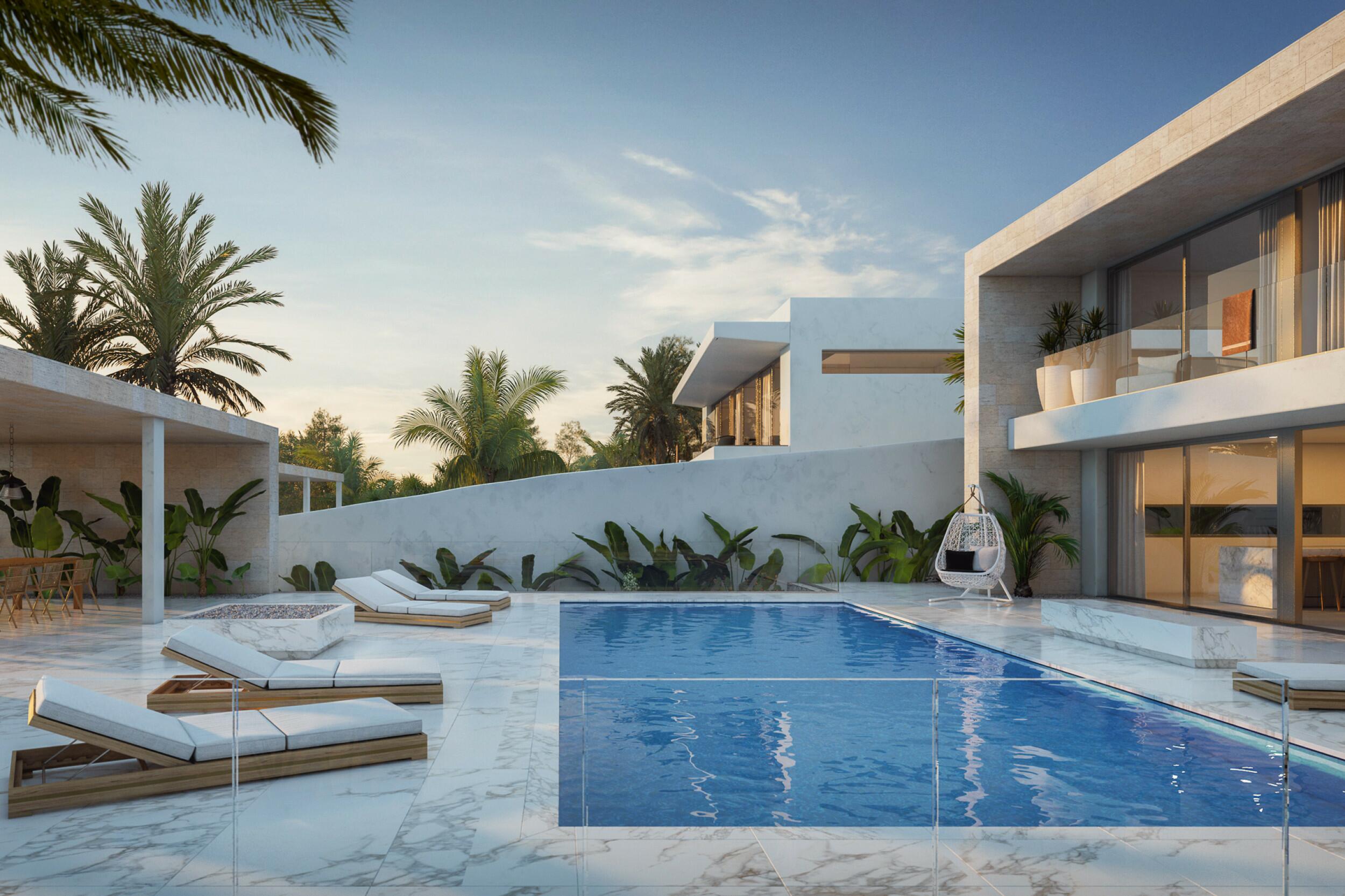 Het geheel heeft in totaal 10 terrassen, twee zwembaden, een daarvan is een overloopzwembad met een indrukwekkend uitzicht over de Middellandse Zee, en een sportveld.