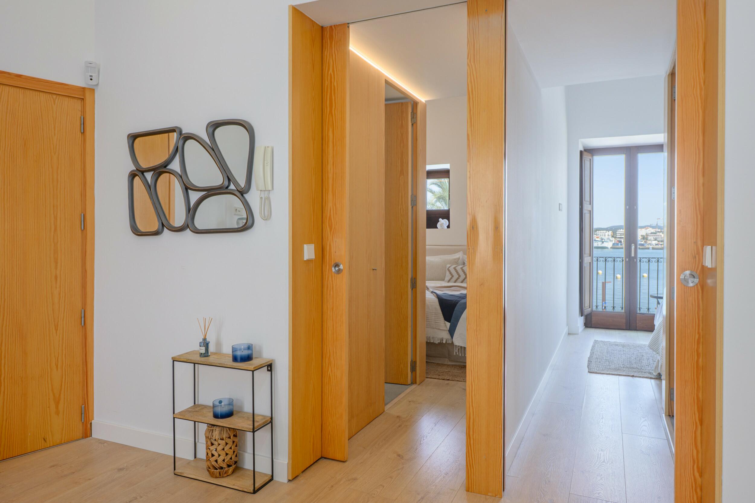 Het pand biedt ongeveer 68 m² aan bebouwde oppervlakte. Het opent direct naar een open woon-, eet- en keukengedeelte, aangevuld met een royale aangrenzende opslagruimte. De indeling omvat twee slaapkamers, elk met een eigen badkamer. Een van de slaapkamers heeft toegang tot een balkon met prachtig uitzicht op de haven.