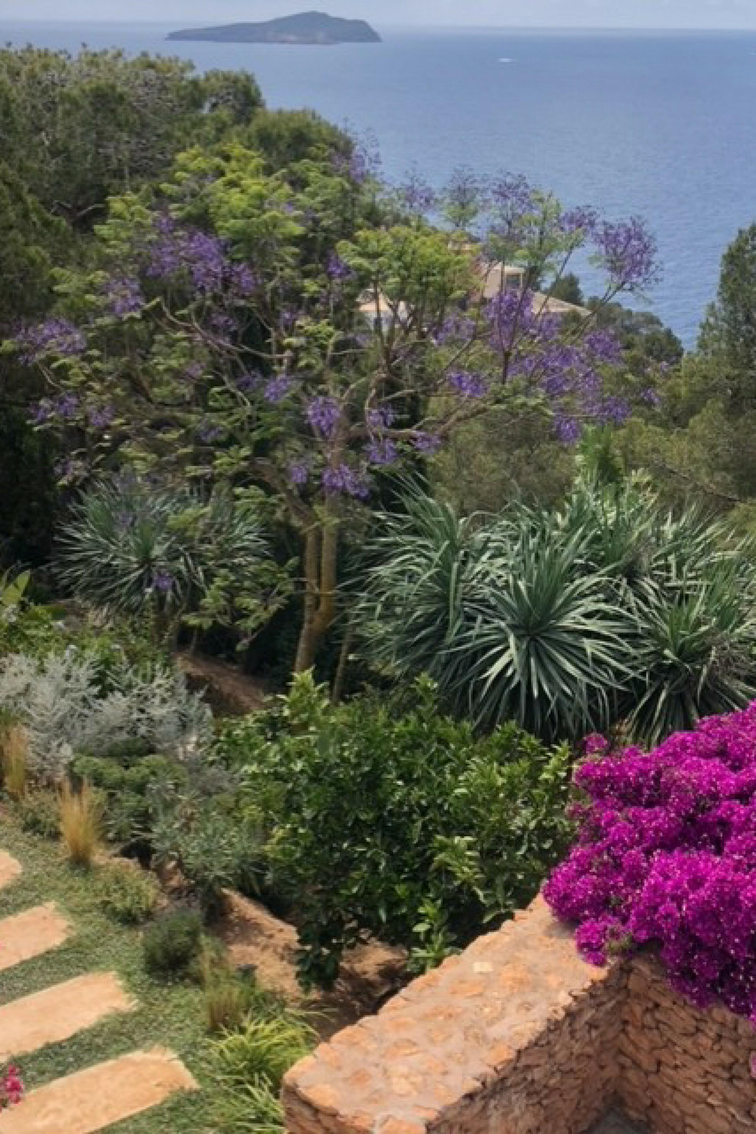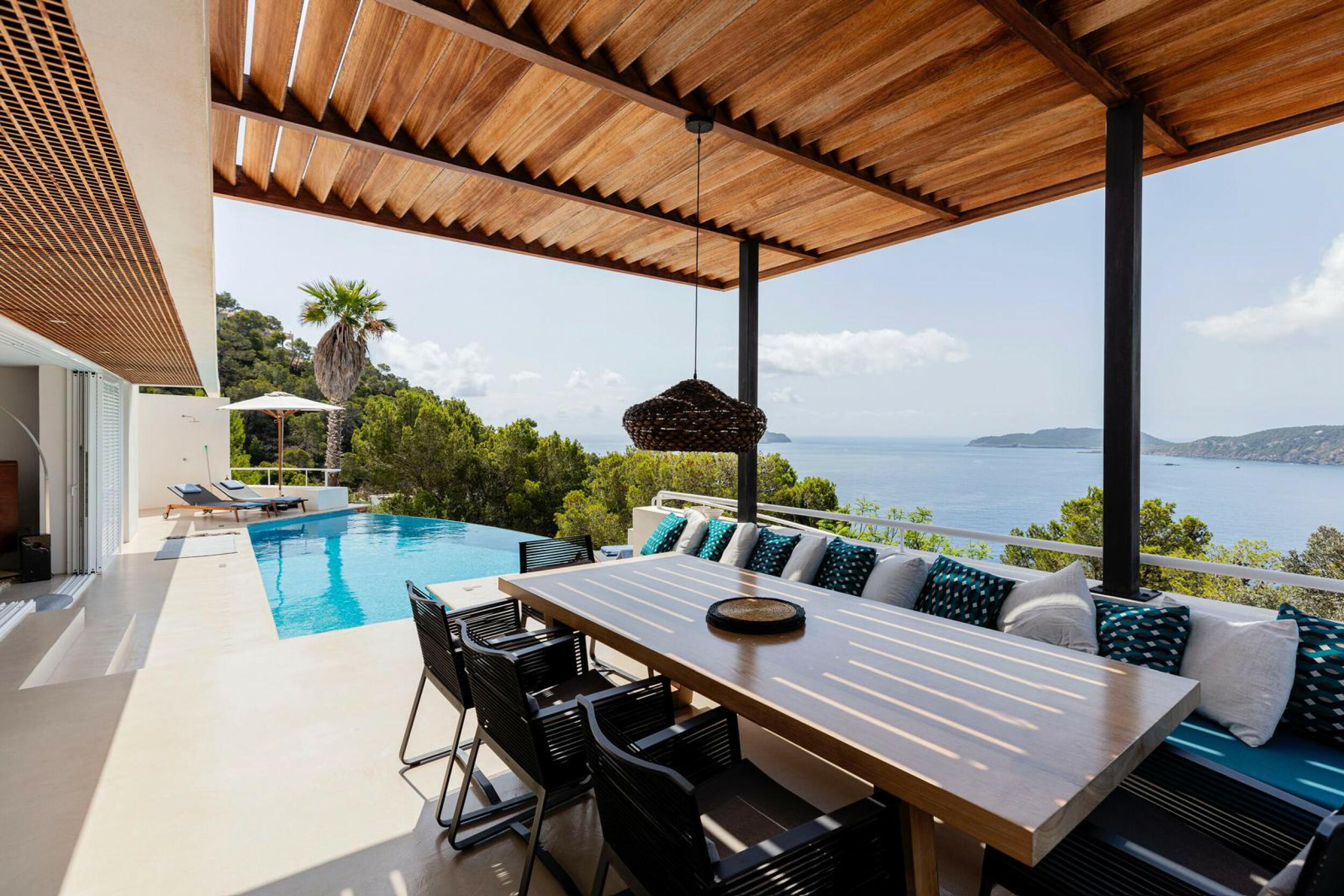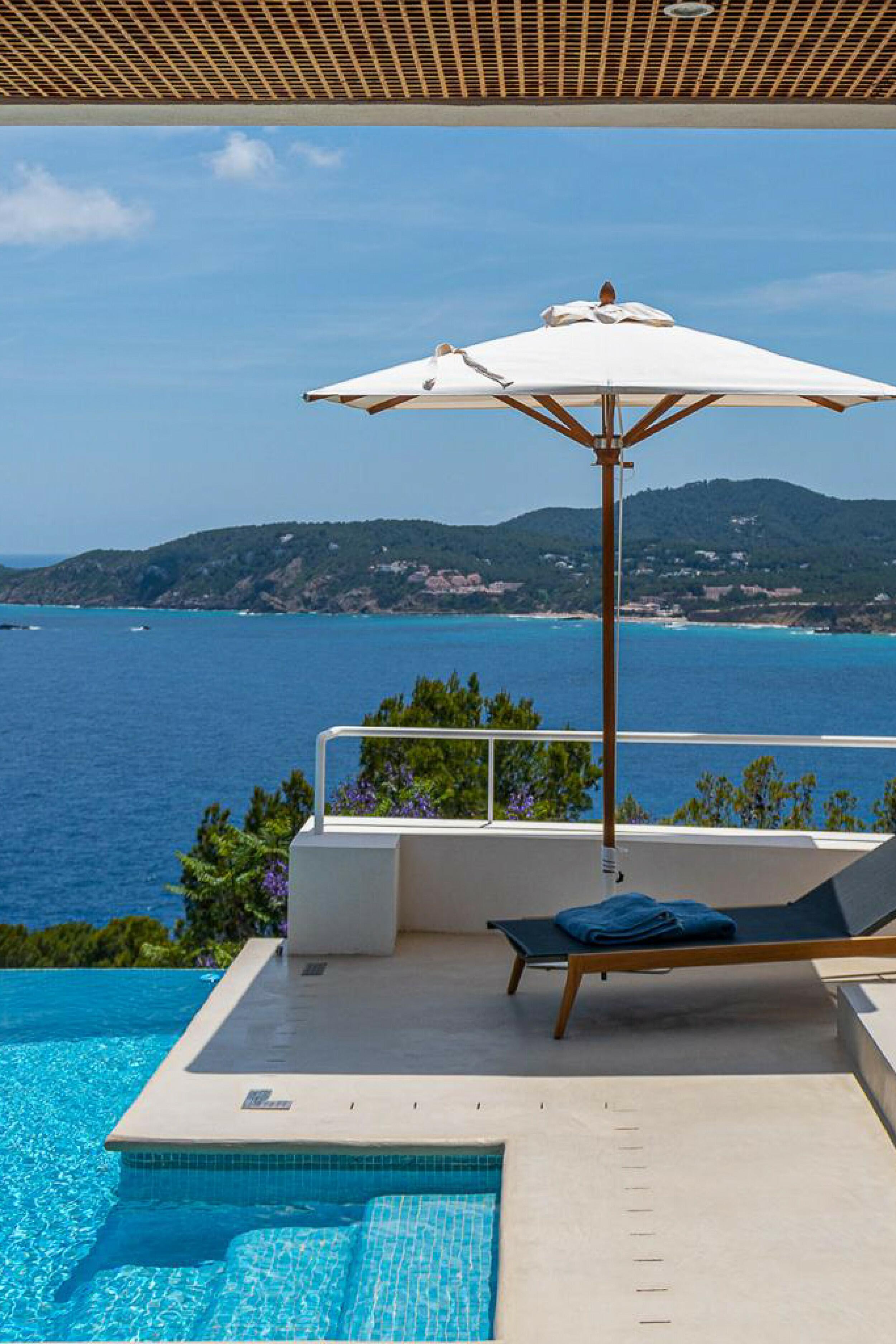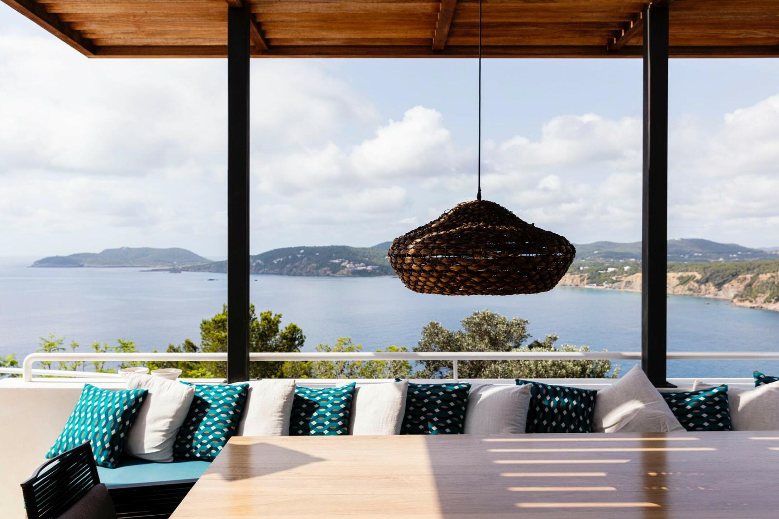The incredibly wide beach is valleyed between steep cliffs, which makes for particularly outstanding scenery and a top sought after location for clifftop exclusive villas and luxury holiday rentals in Ibiza.