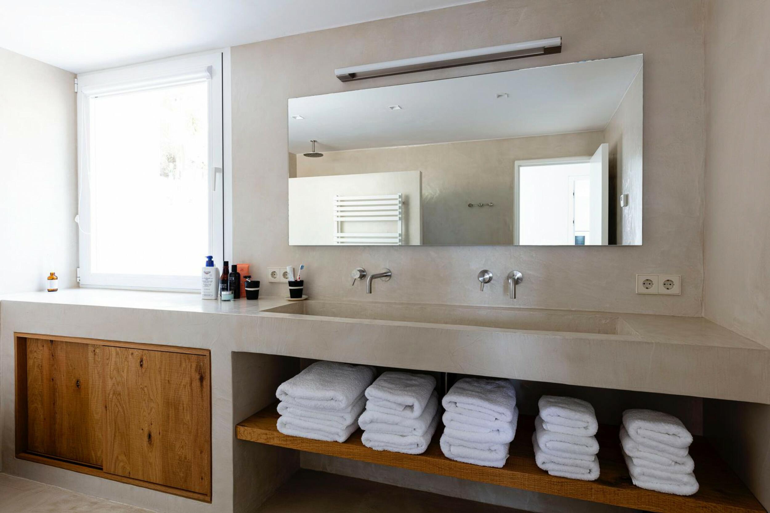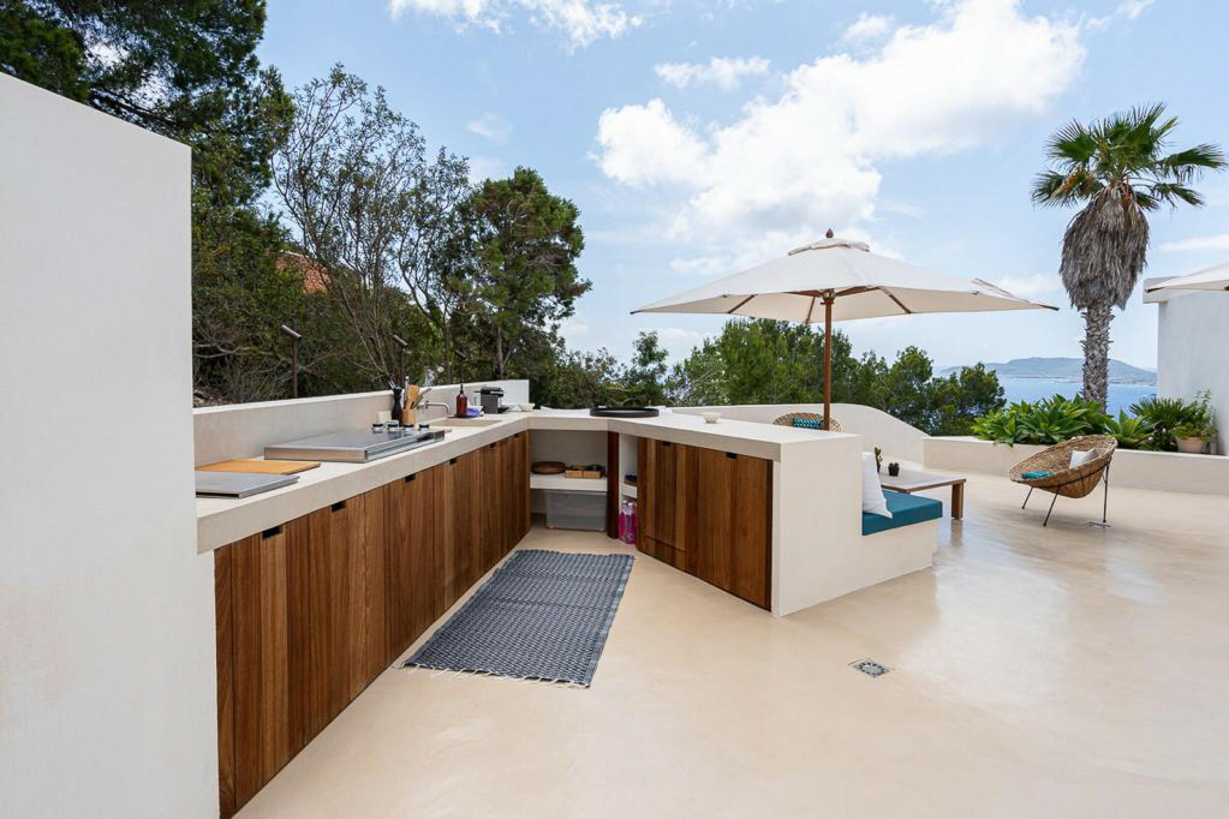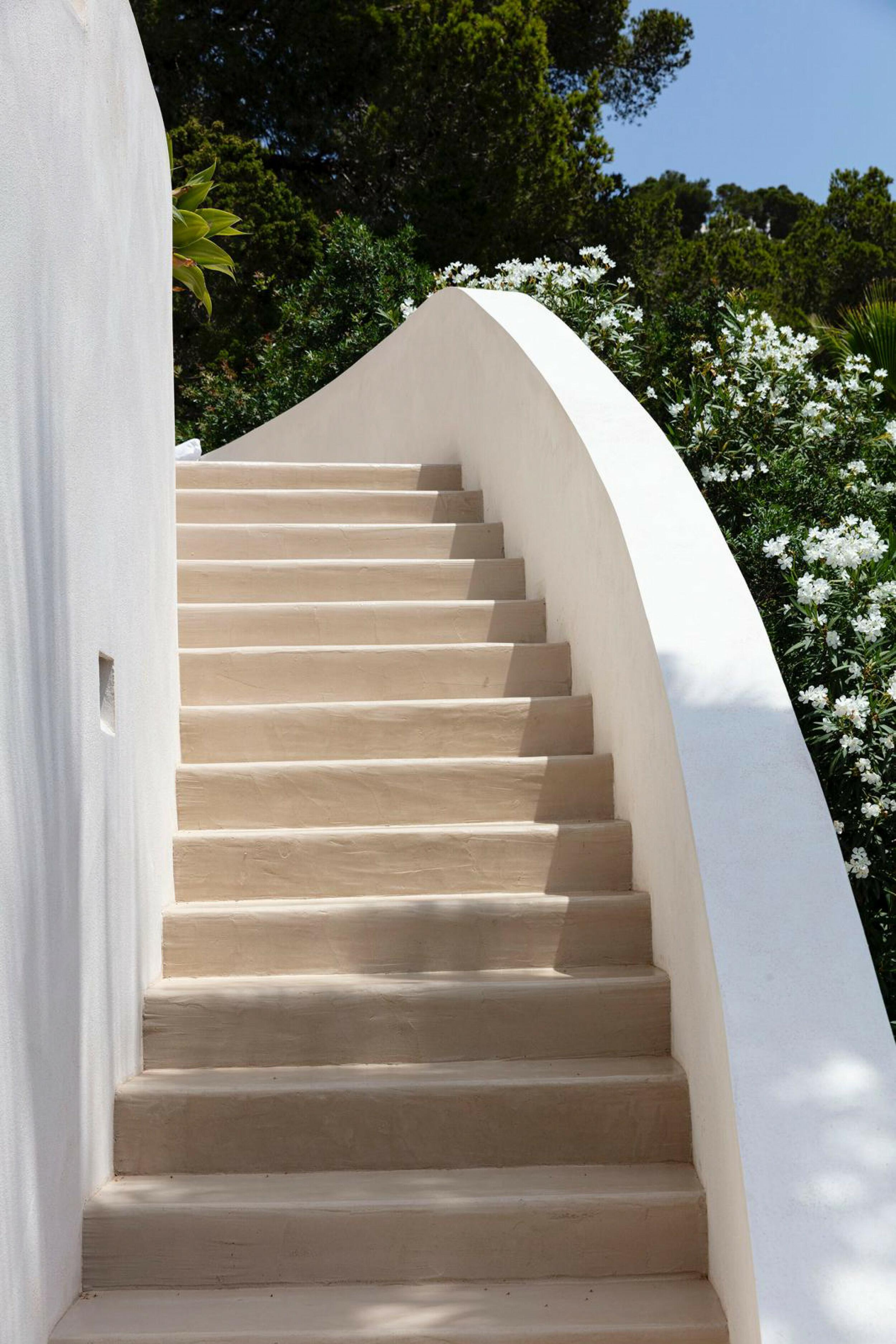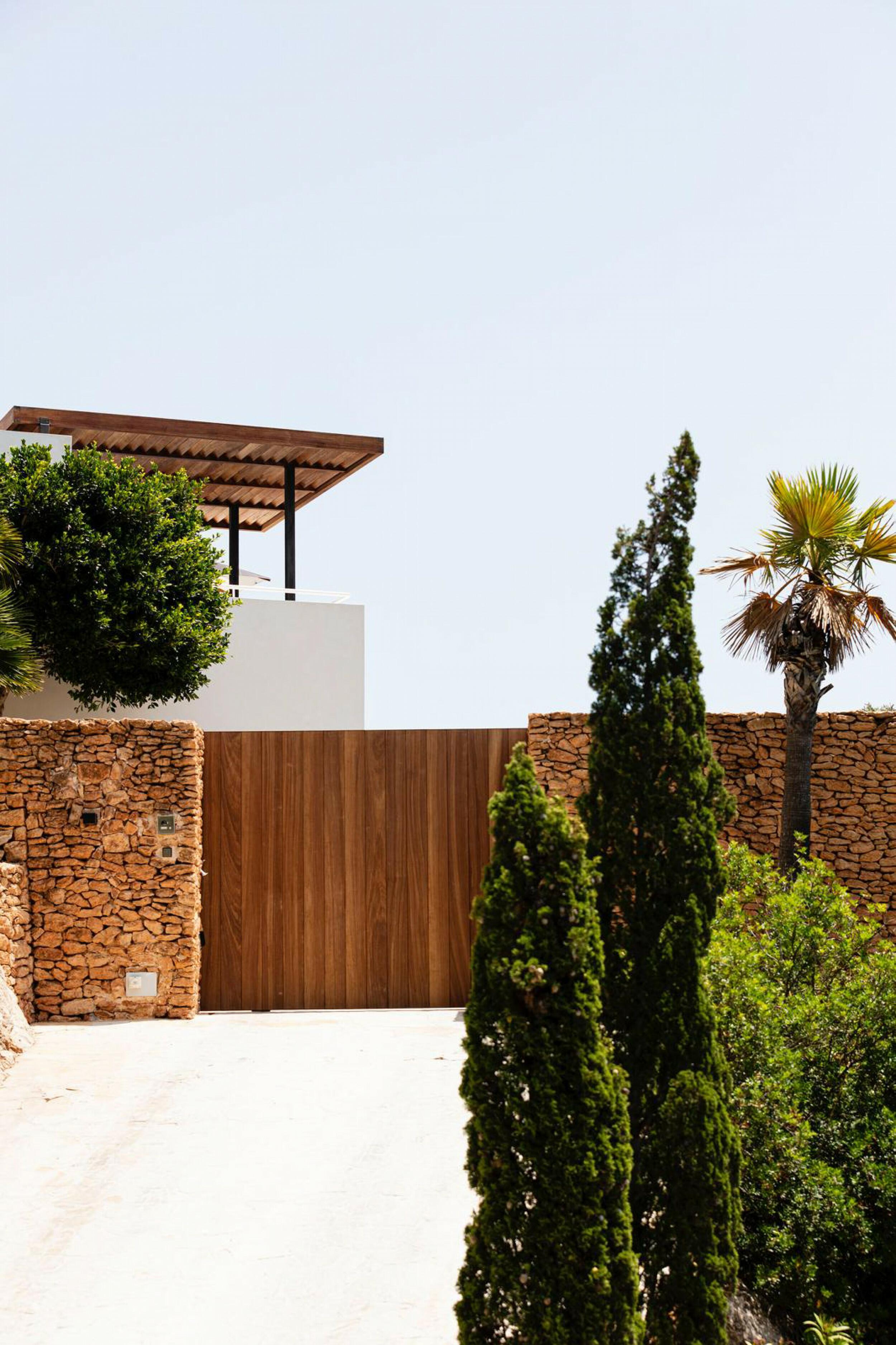 The incredibly wide beach is valleyed between steep cliffs, which makes for particularly outstanding scenery and a top sought after location for clifftop exclusive villas and luxury holiday rentals in Ibiza.