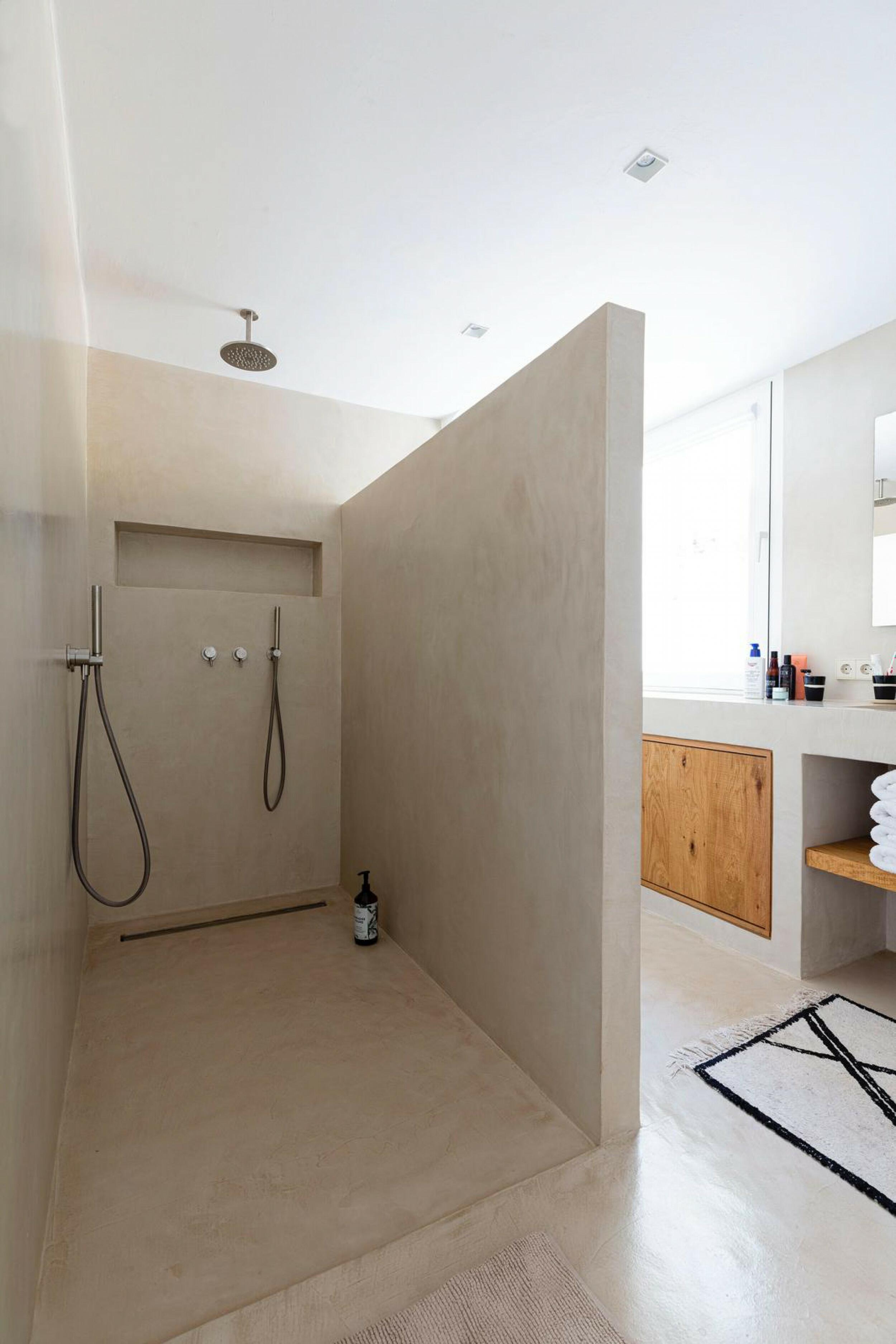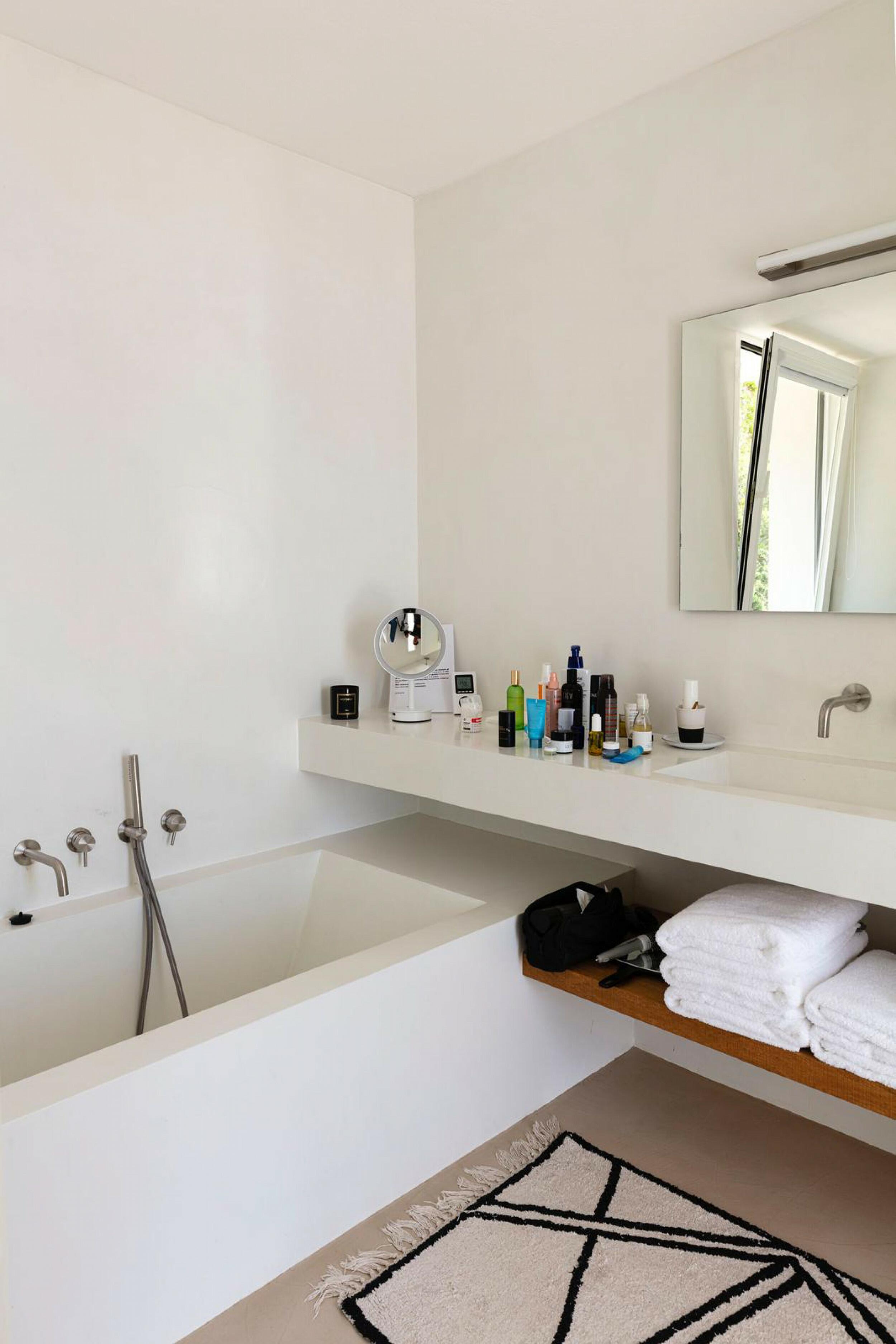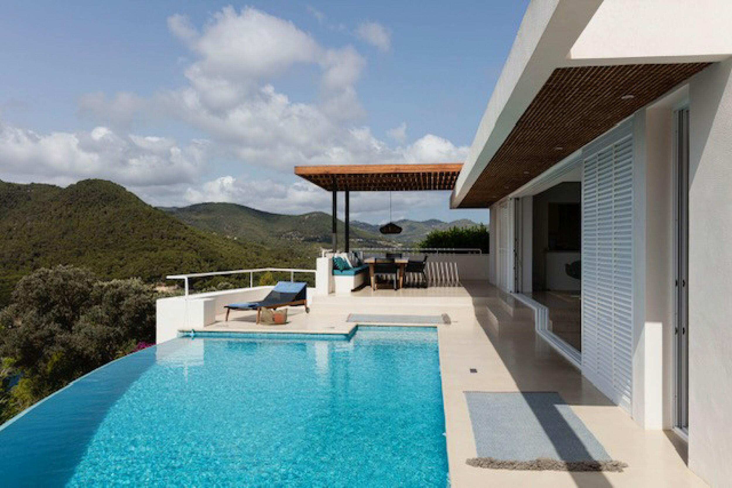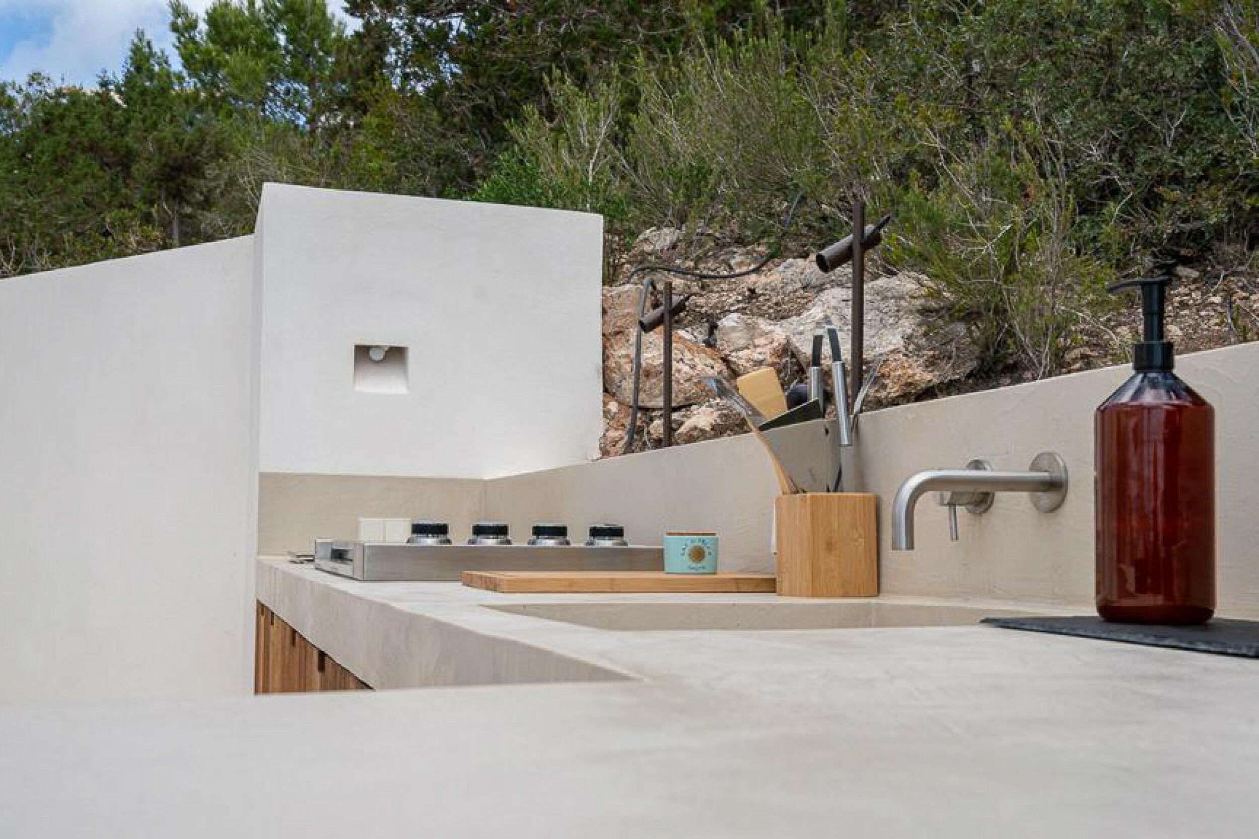 The incredibly wide beach is valleyed between steep cliffs, which makes for particularly outstanding scenery and a top sought after location for clifftop exclusive villas and luxury holiday rentals in Ibiza.